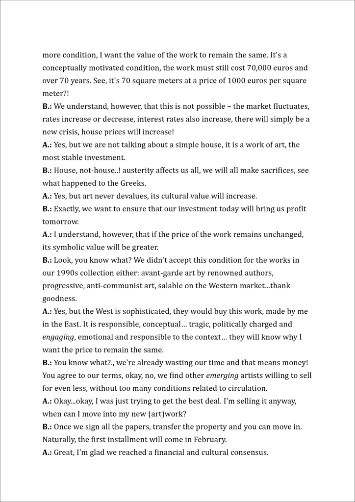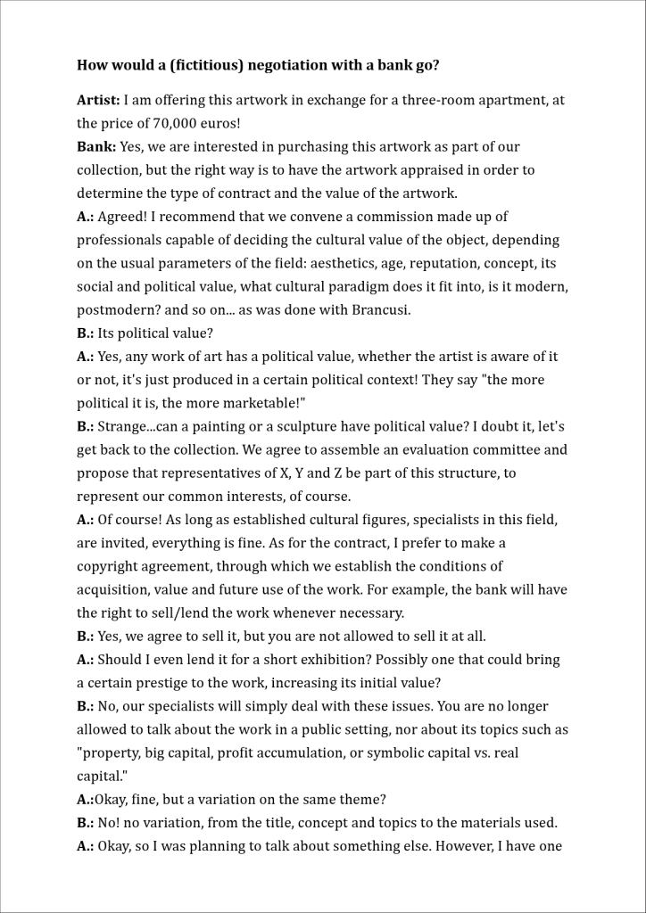 Work in the contemporary art and education industries is often conditioned by the provision of a decent living and a living space adequate to our basic needs. Originally conceived as a playful exercise in creative writing within the previous research, the experiment of negotiating with a bank does not even hypothetically assume the existence of balanced democratic forces of negotiation. However, the plan of the personal apartment presented in the triptych highlights the current and future efforts transformed and devalued into commodities, now and in the very long term.